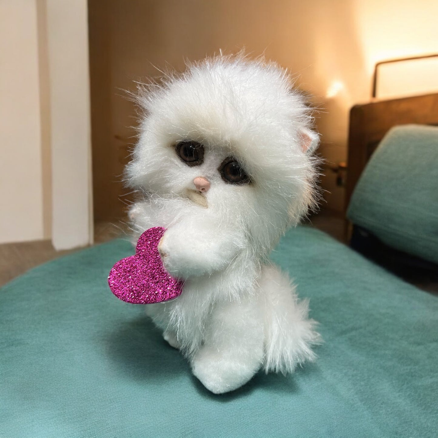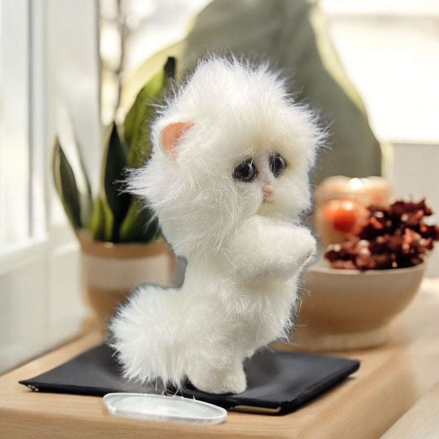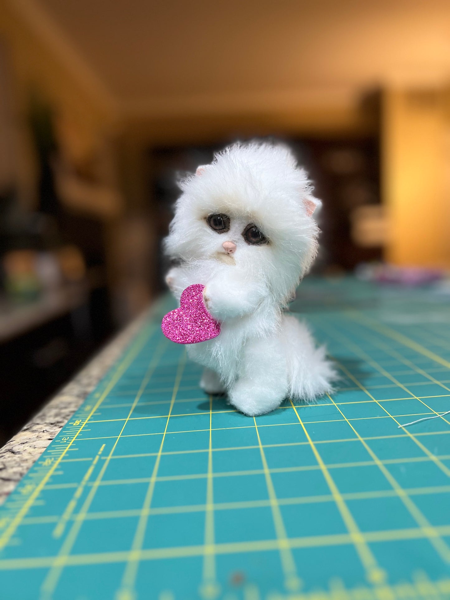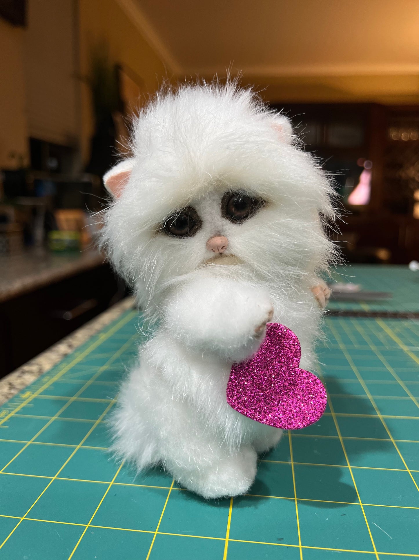 Meet Snowball, your new cuddly companion! This charming handmade stuffed kitten stands at 6.5 inches tall and is crafted with love and care. Snowball features soft, fluffy white fur and adorable details that bring warmth to any room. Filled with cedar dust, this plush toy not only feels delightful but also offers a subtle, natural scent.
