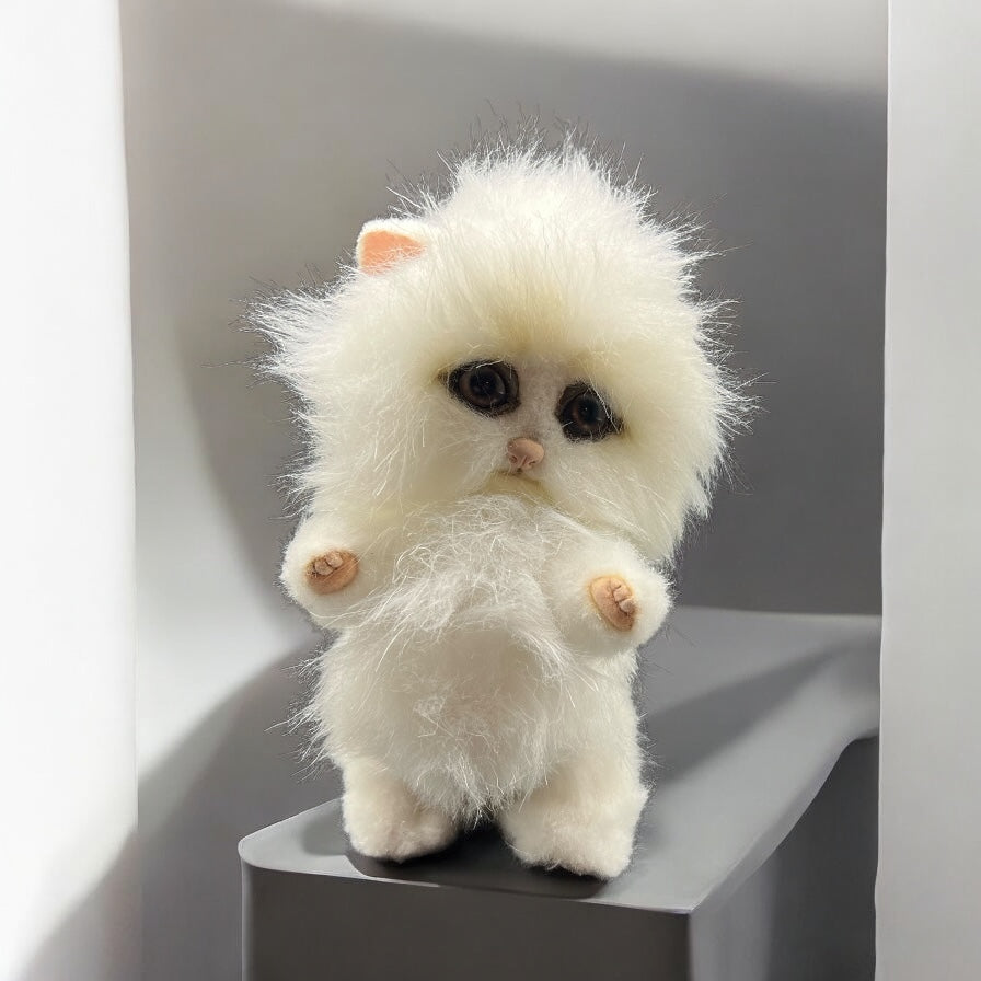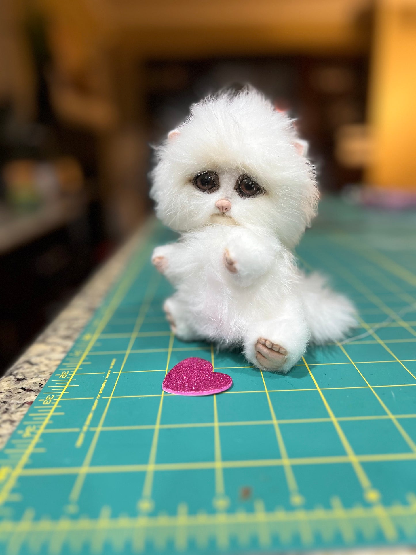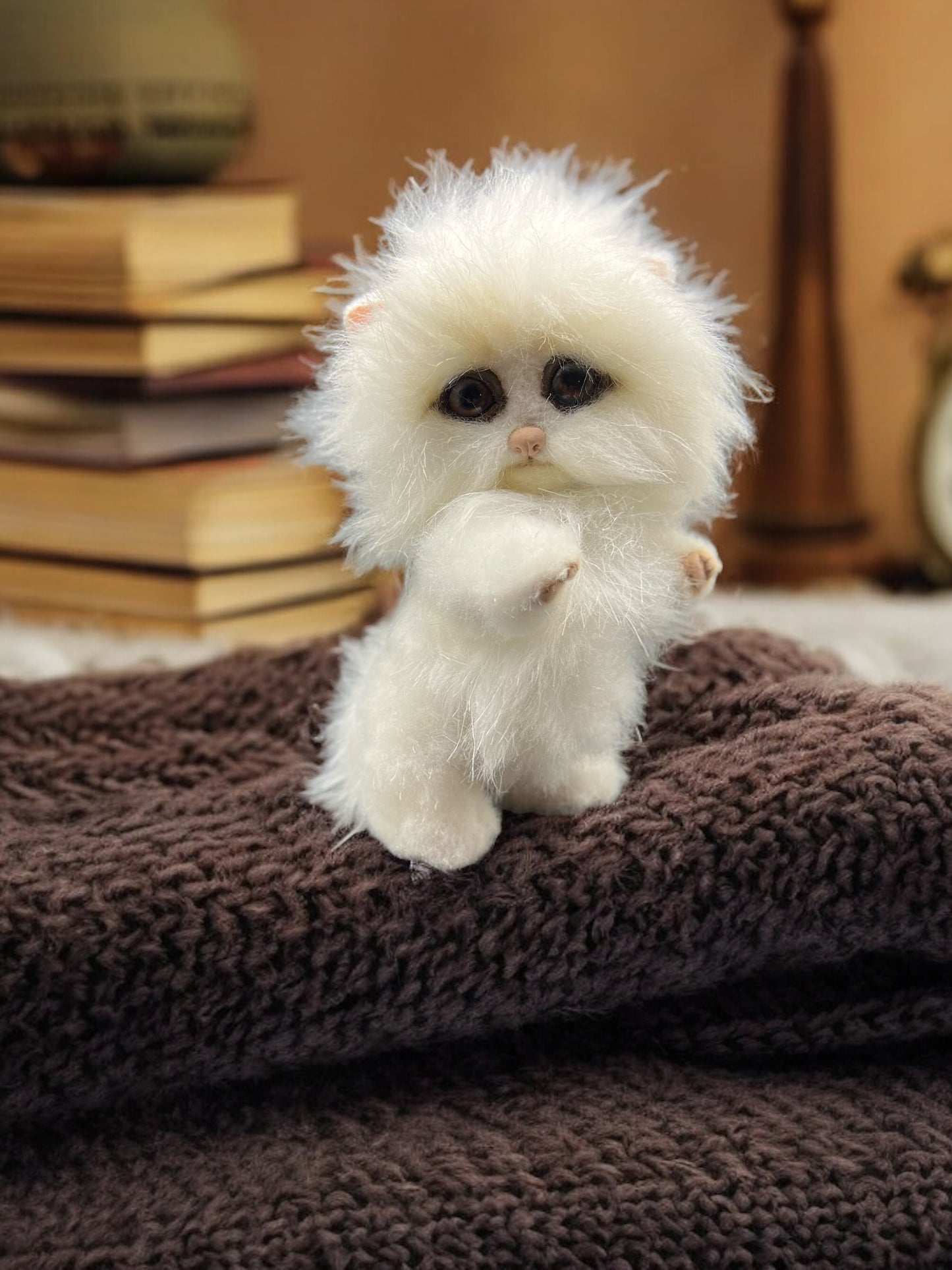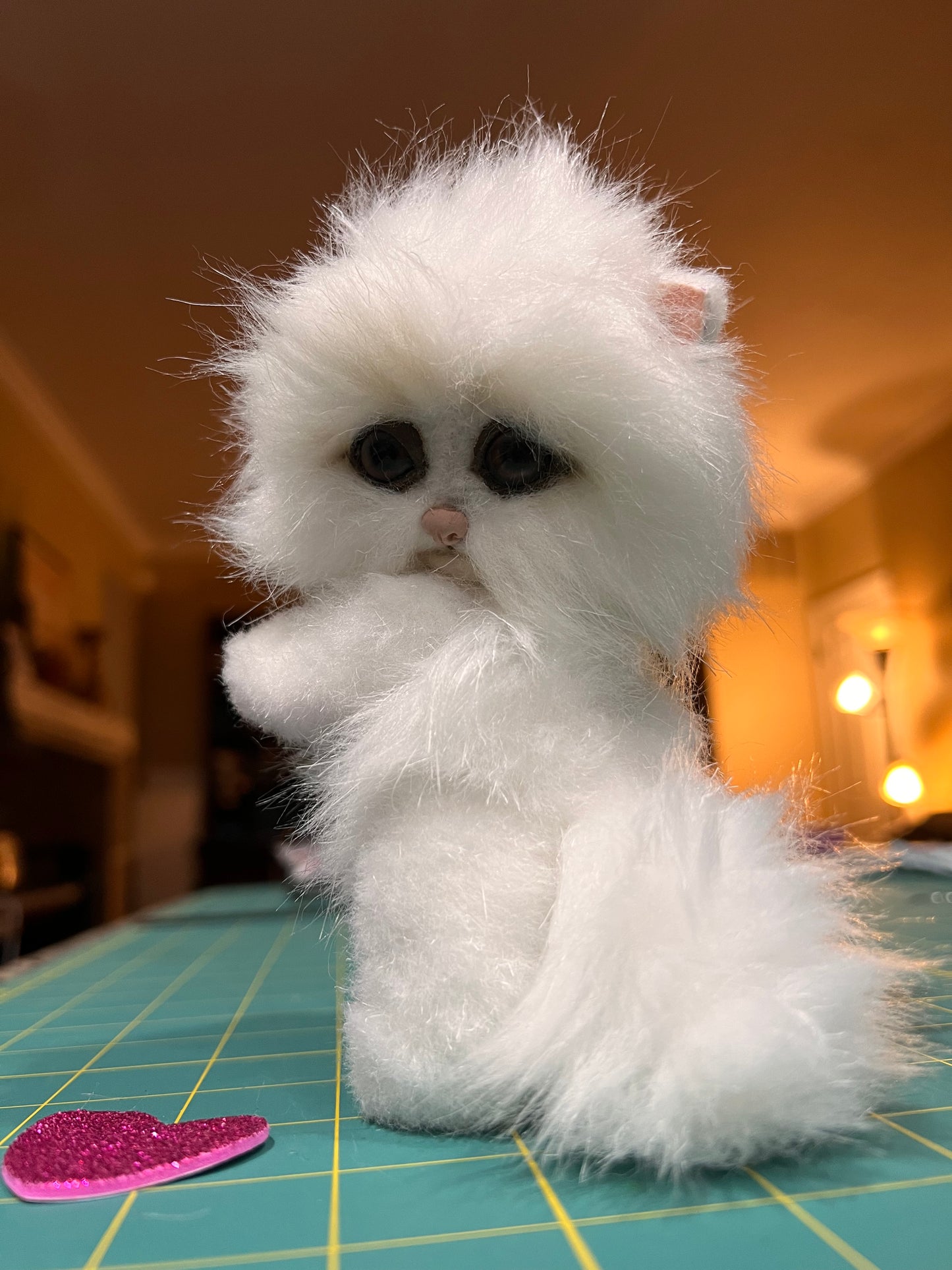 Meet Snowball, your new cuddly companion! This charming handmade stuffed kitten stands at 6.5 inches tall and is crafted with love and care. Snowball features soft, fluffy white fur and adorable details that bring warmth to any room. Filled with cedar dust, this plush toy not only feels delightful but also offers a subtle, natural scent.
